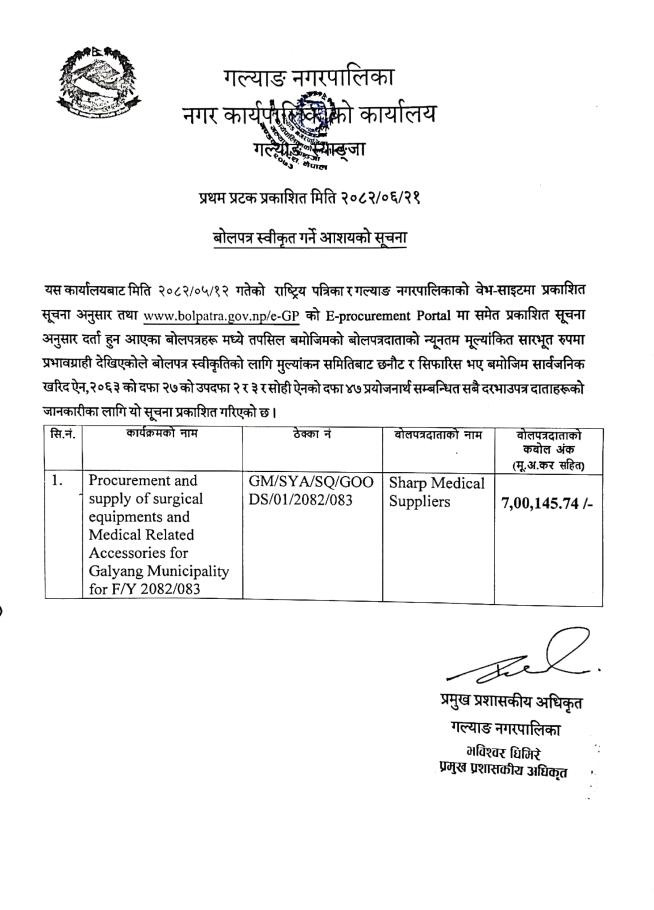 बोलपत्र स्वीकृत गर्ने आशयको सूचना