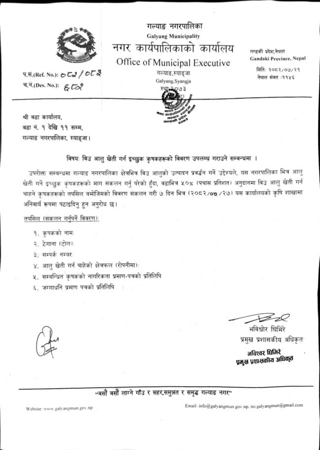 बिउ आलु खेती गर्न इच्छुक कृषकहरूको विवरण उपलब्ध गराउने सम्बन्धमा